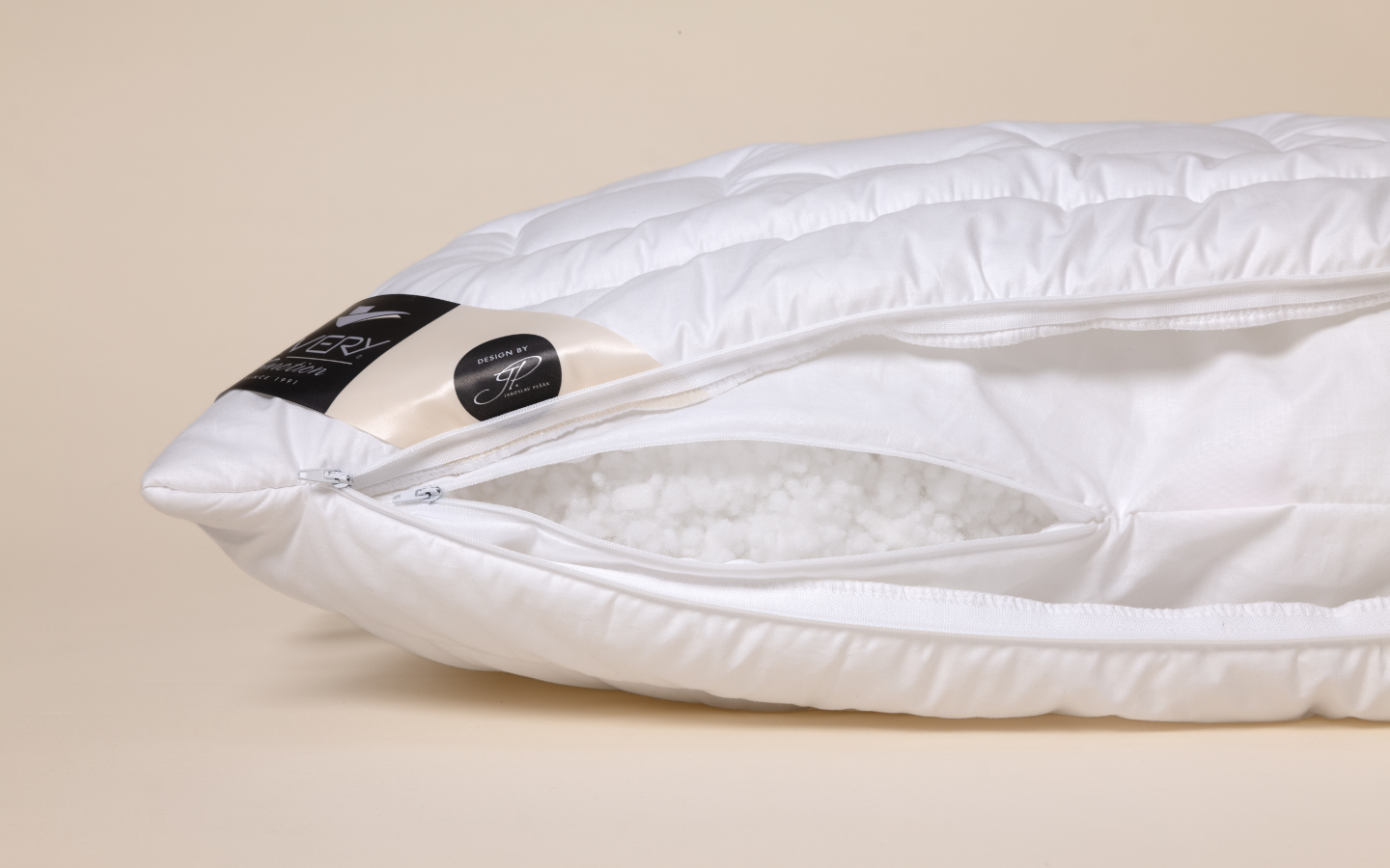 Polštář je složený ze dvou samostaných částí – z obalu a náplně. Obal je snímatelný a samostatně pratelný při teplotě do 60° C. Náplň je uložena v samostatném vaku ze 100% bavlny, který je rovněž opatřený zipem pro optimální úpravu náplně, kterou tvoří směs z jemných polyesterových „kuliček“ a speciálních polyuretanových tyčinek.